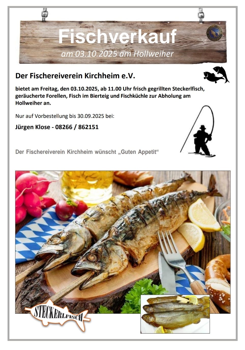 Aktuelles Der Weg zu uns 30.03.25 Marktstand Frühjahrsmarkt18.04.25 Karfreitag Fischverkauf01.05.25 Anfischen29.05.25 Königsfischen08.06.25 Pfingstsonntag Fischerfestdes Fischereiverein Kirchheim am Hollweiher Beginn: 10:30 Uhr03.10.25 Fischverkauf05-06.12.25 AdventszauberGanzjährig: Jugendtermine gemäß Planung der Jugendleitung Fischereiverband-Schwaben